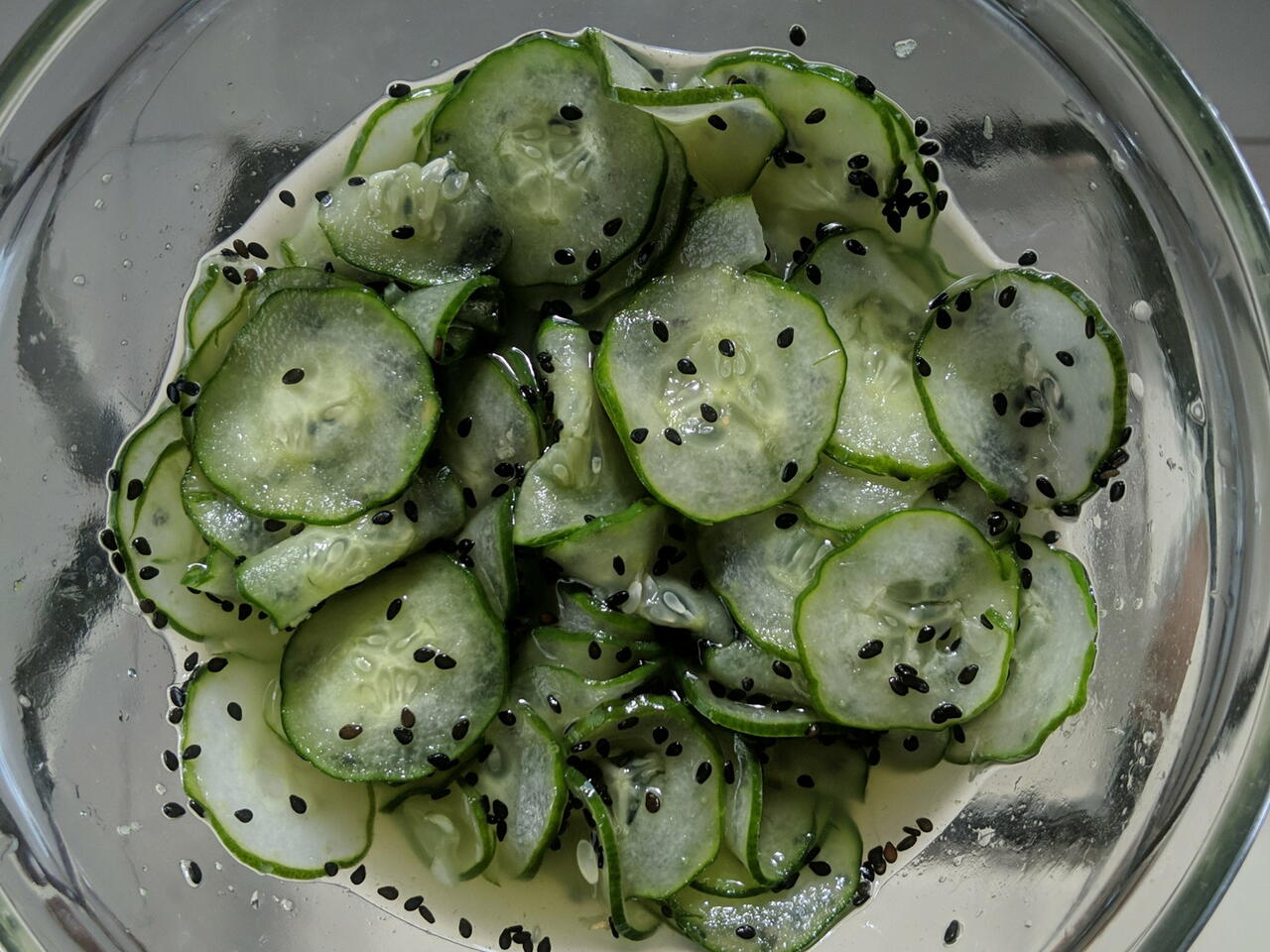 Depois de desidratado coloque os pepinos em uma vasilha, acrescente a calda o gengibre e o gergelim, mexa bem.