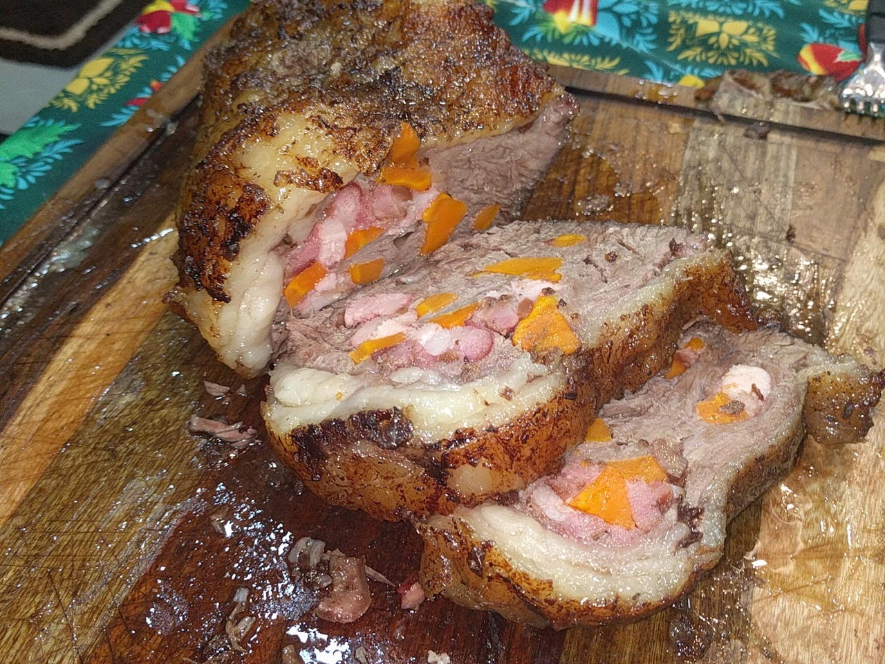 Pique a cenoura e o bacon, em seguida fure a picanha e coloque o recheio.