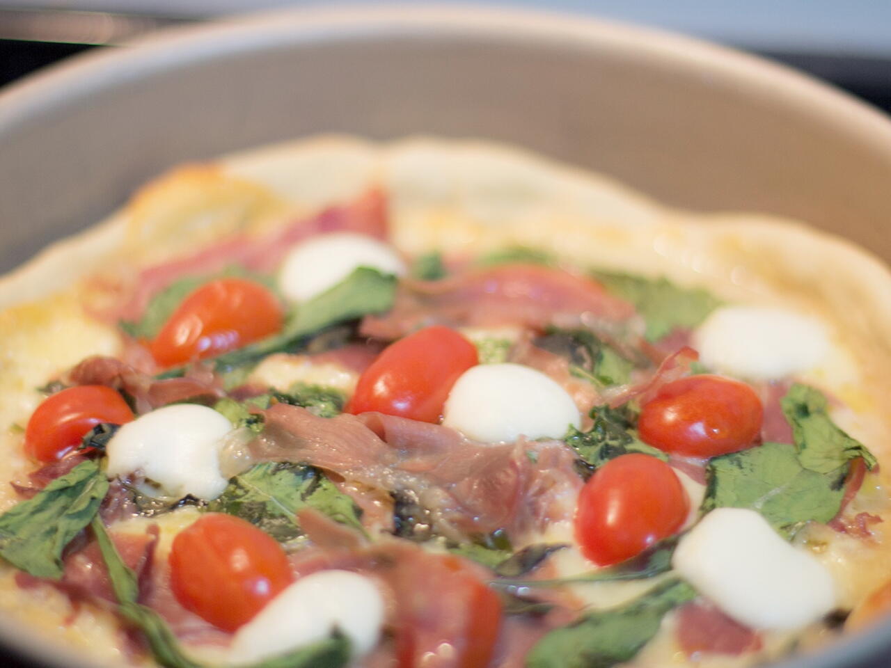 Prepare os ingredientes e forre a massa com o queijo mussarela. Em seguida adicione os ingrediente e leve ao forno por 20min a 210 graus.