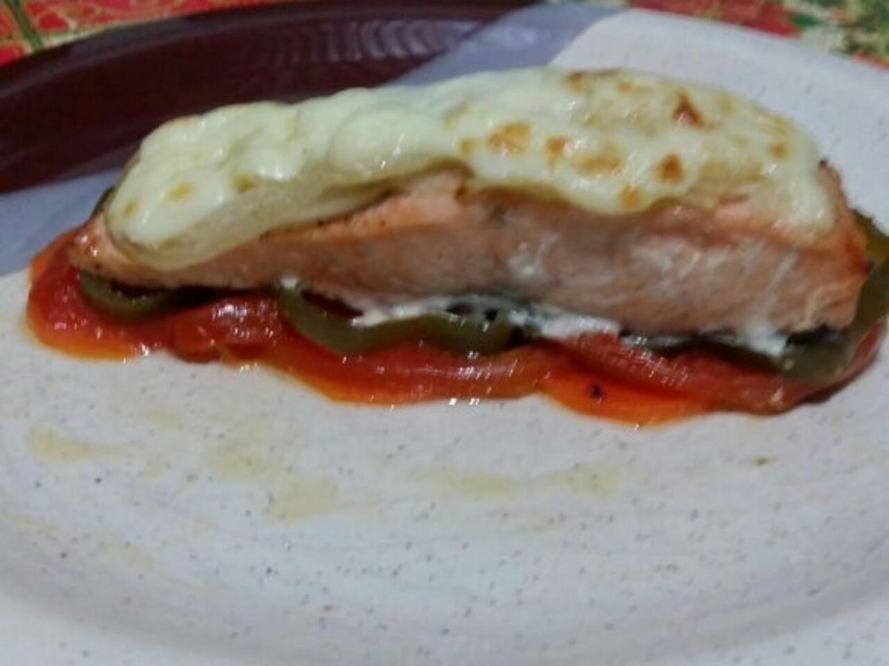 Monte da seguinte maneira: cenouras, tomate, pimentão, salmão e cebola. Regue tudo com azeite de oliva.