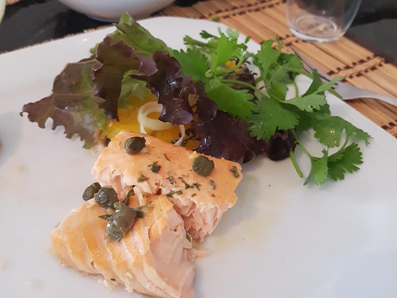 Para o molho : coloque na frigideira a manteiga com o azeite, acrescente as alcaparras (lave ela em água corrente pois é muito salgada). Refogue e acrescente a salsa. Coloque o molho em cima do salmão depois de assado. Sirva com salada.