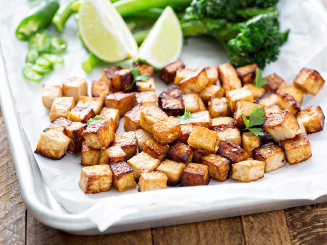 Grelhar tiras/cubos de tofu e salpicar com ervas frescas e gergelim
