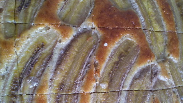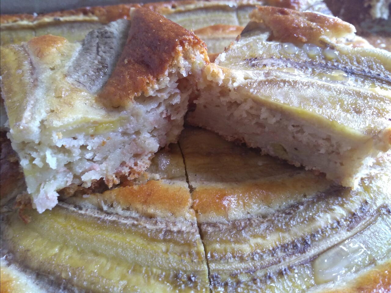 Corte as bananas em rodelas. Após ter cortado junte-as todas com a massa pronta na batedeira. Misture-as mais um pouco. Acrescente o fermento e misture .