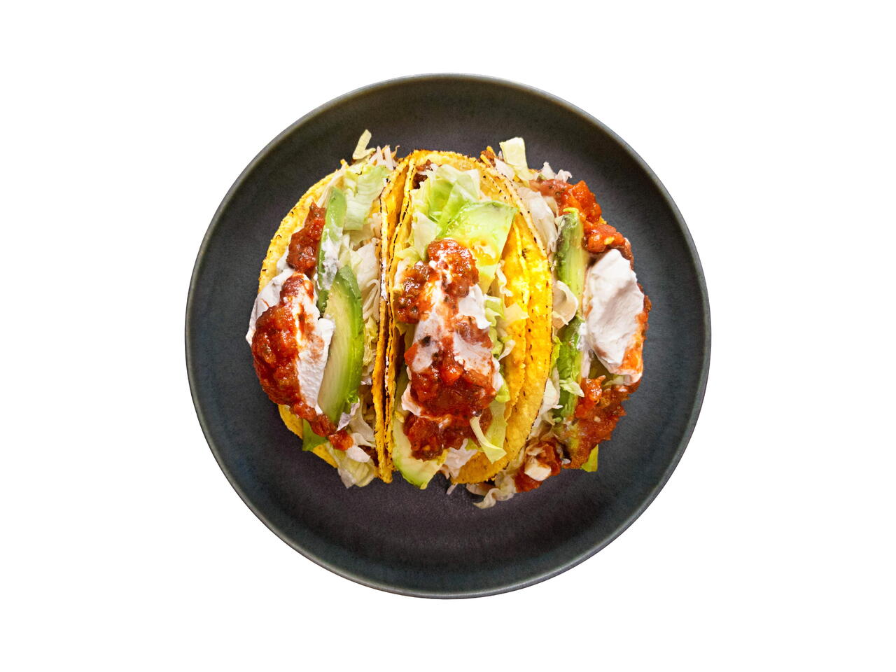 Comece com a carne no fundo da tortilha, cubra com o queijo para que ele derreta um pouco e, então, adicione o alface retalhado, o creme azedo, salsa e abacate!