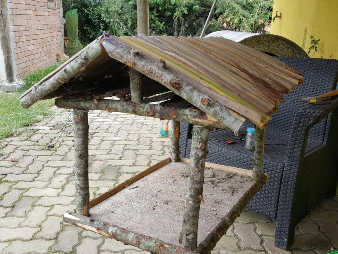 Cortar os galhos, levá-los com prego fino montando a estrutura da casa, comece de baixo para cima. O telhado deve ser colado com silicone quente. Por fim envernize, exponha em local aberto com frutas e alpiste e nunca precisará trancar um pássaro.