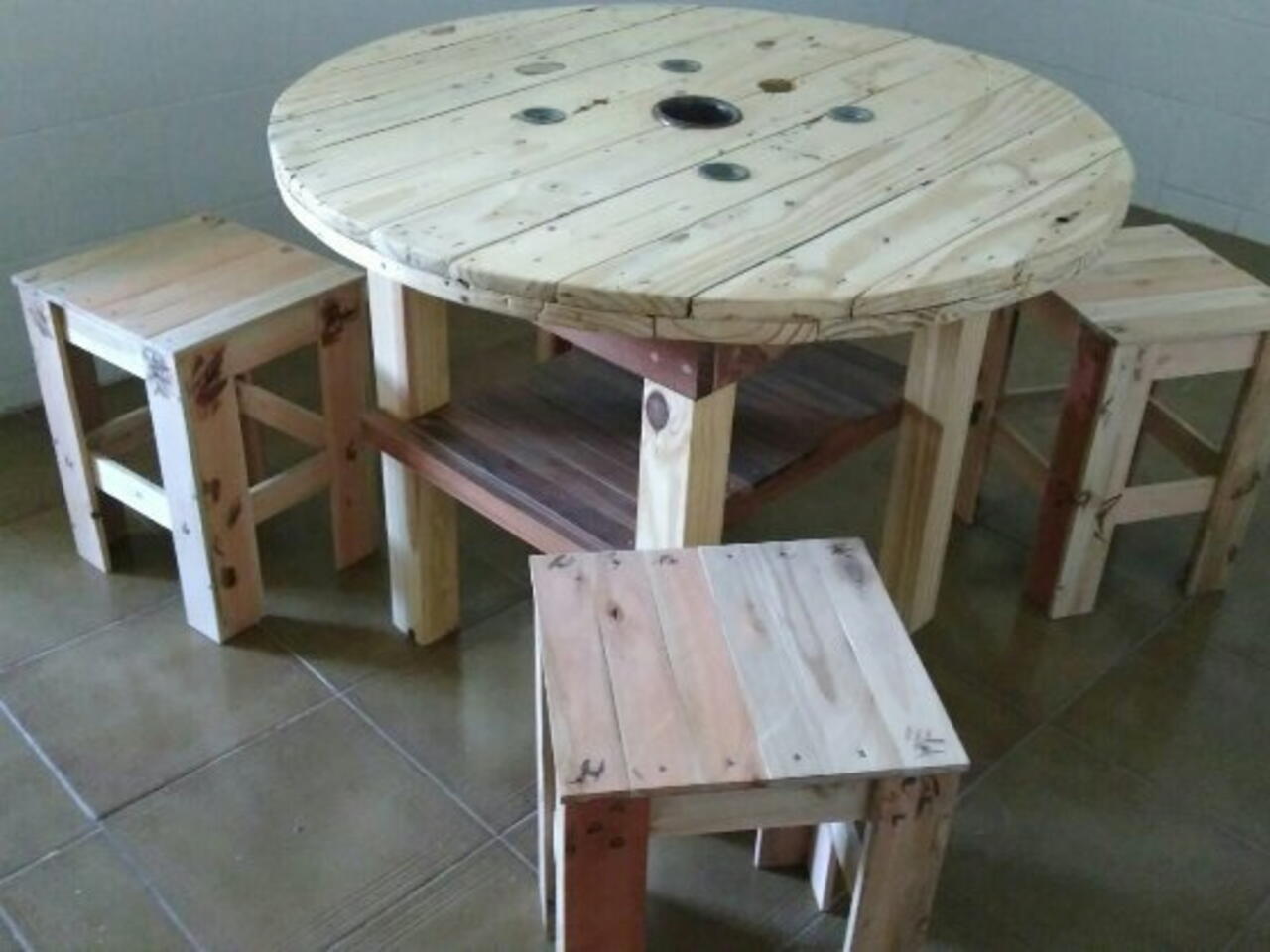 Primeiro desmontei o carretel e em seguida usei esmerilhadeira com uma lixa 36 para de uso em metal para fazer o desbaste, depois com a roto orbital lixei com lixa 80, em seguida com a lixa 180 e por fim a 320, depois tirei as medidas dos pés que são feitos de pinus, logo em seguida cortei na serra circular ( usei esquadro ), com a furadeira fiz os furos nos lugares marcados, depois usei cola e parafusos para montar.