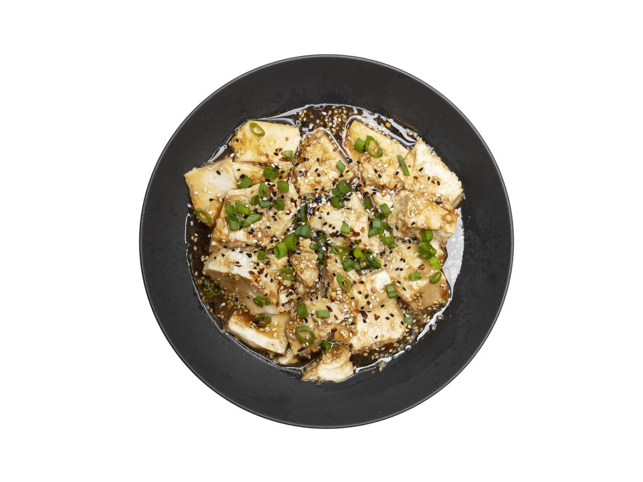 将嫩豆腐放入适用于微波炉的碗或盘中。 把酱汁倒在豆腐上,用勺子把它弄碎。