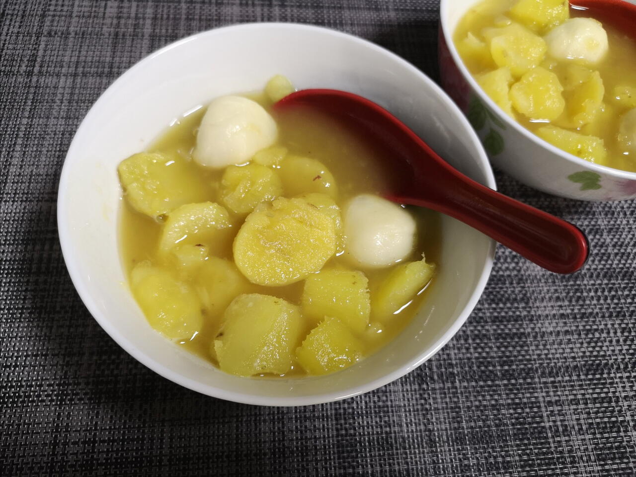 水滾後轉中火,放薑片蕃薯煲25分鐘