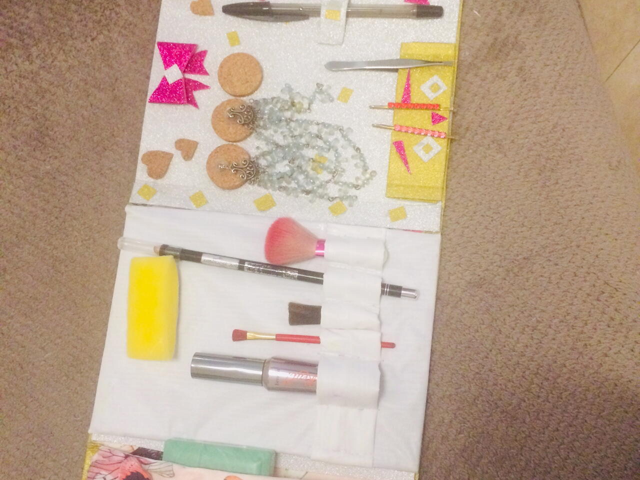 Cortar el papel a la medida que deseas y pegar ambas partes,dejas en agua hirviendo el corcho del vino y cuando aumenta el doble su tamaño ya podrás cortarlo coser en el espacio para pinceles sobre la tela impermeable y luego lo pegas al molde