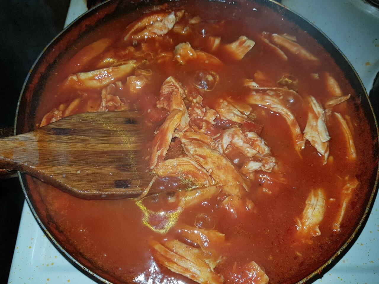 Ya que tenemos la pechuga desmechada la agregamos a la salsa de tomates, cocinamos por 2 min.
