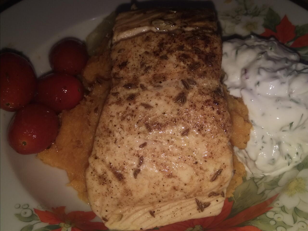 Podáváme pyré na to losos a dip.