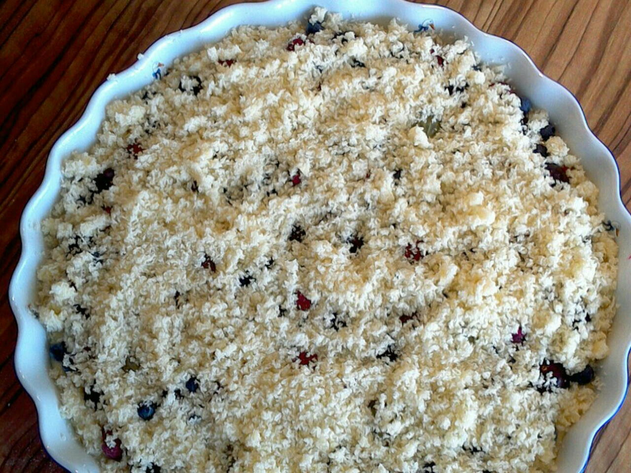 Máslo, cukr a mouku smícháme až se směs bude drobit a posypeme koláč, který se teprve bude péct.