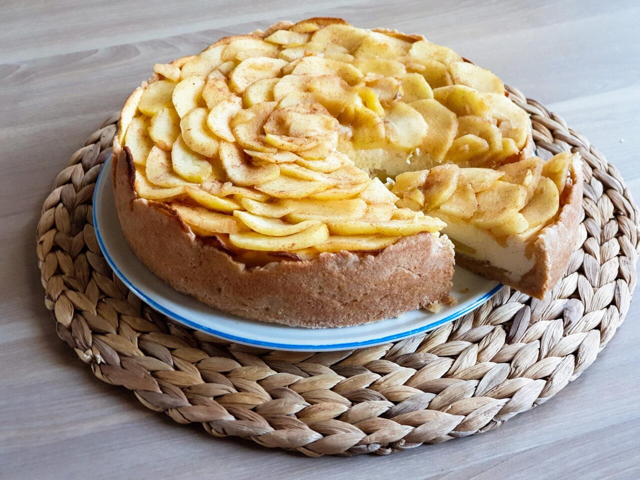 Tvaroh, smetanu, žloutky, krupicový a vanilkový cukr, citronovou šťávu a pudink společně rozmícháme a nakonec zlehka vmícháme sníh z bílků. Směs nalijeme na rozetřená jablka. Pečeme v předehřáté troubě zvolna cca 60 minut.