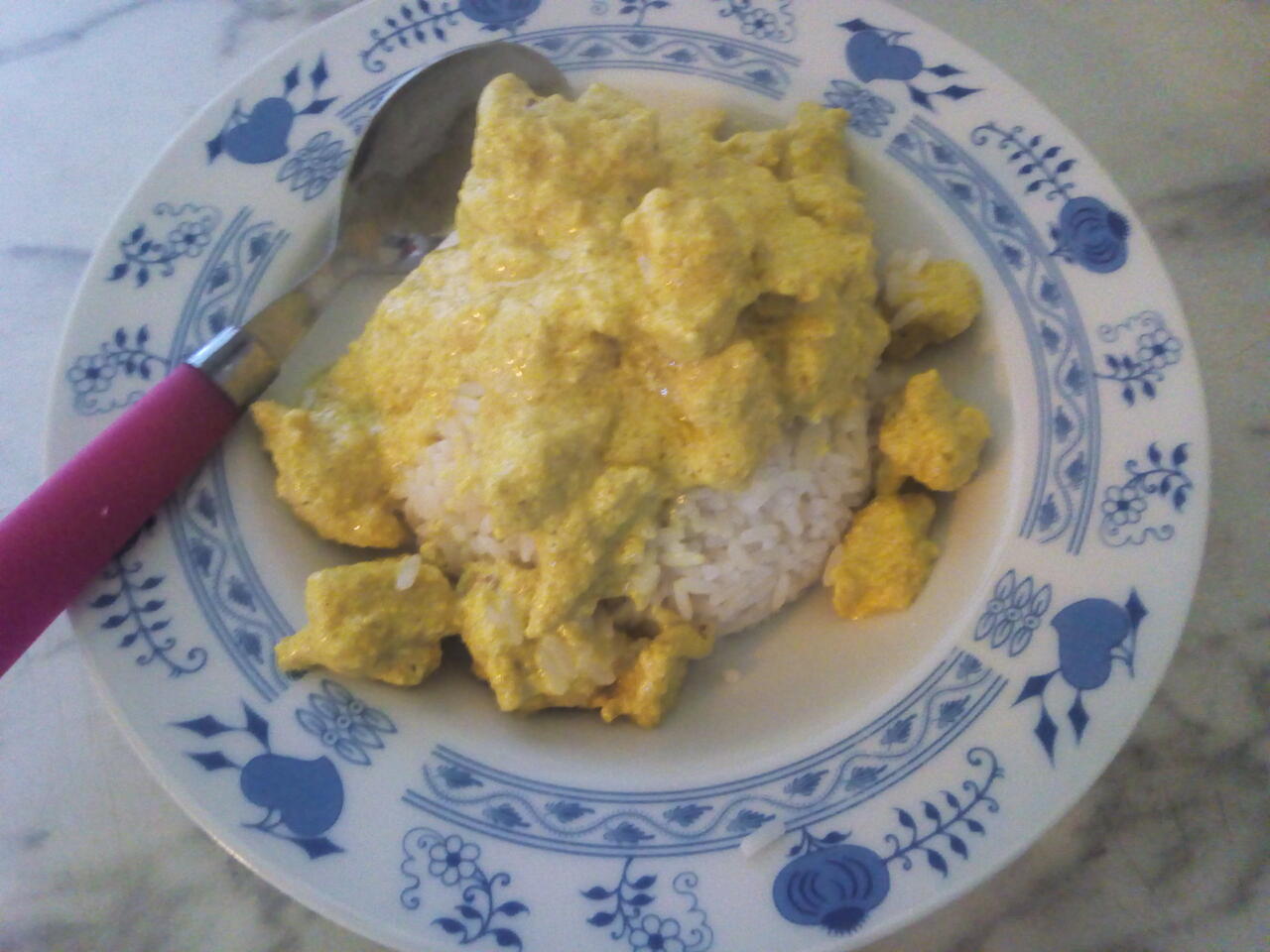 Až se kuřecí maso zatáhne, nasypeme kari koření. Při stálém míchání vypracujeme. Nalijeme smetany a stále mícháme ať se nepřichytí.