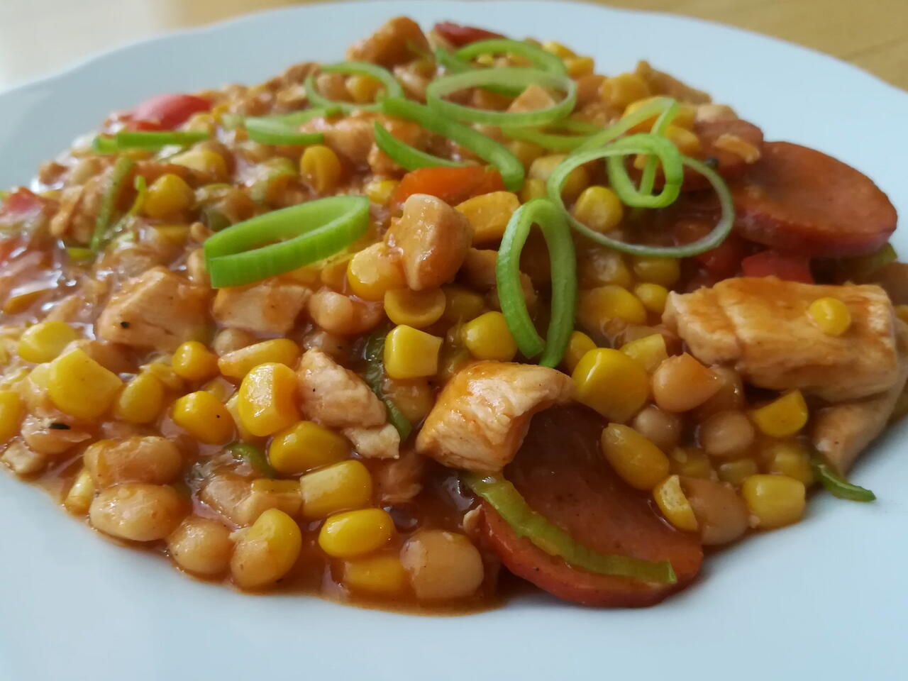 Přisypeme kukuřici a pořádně promícháme. Přidáme kečup a necháme prohřát.