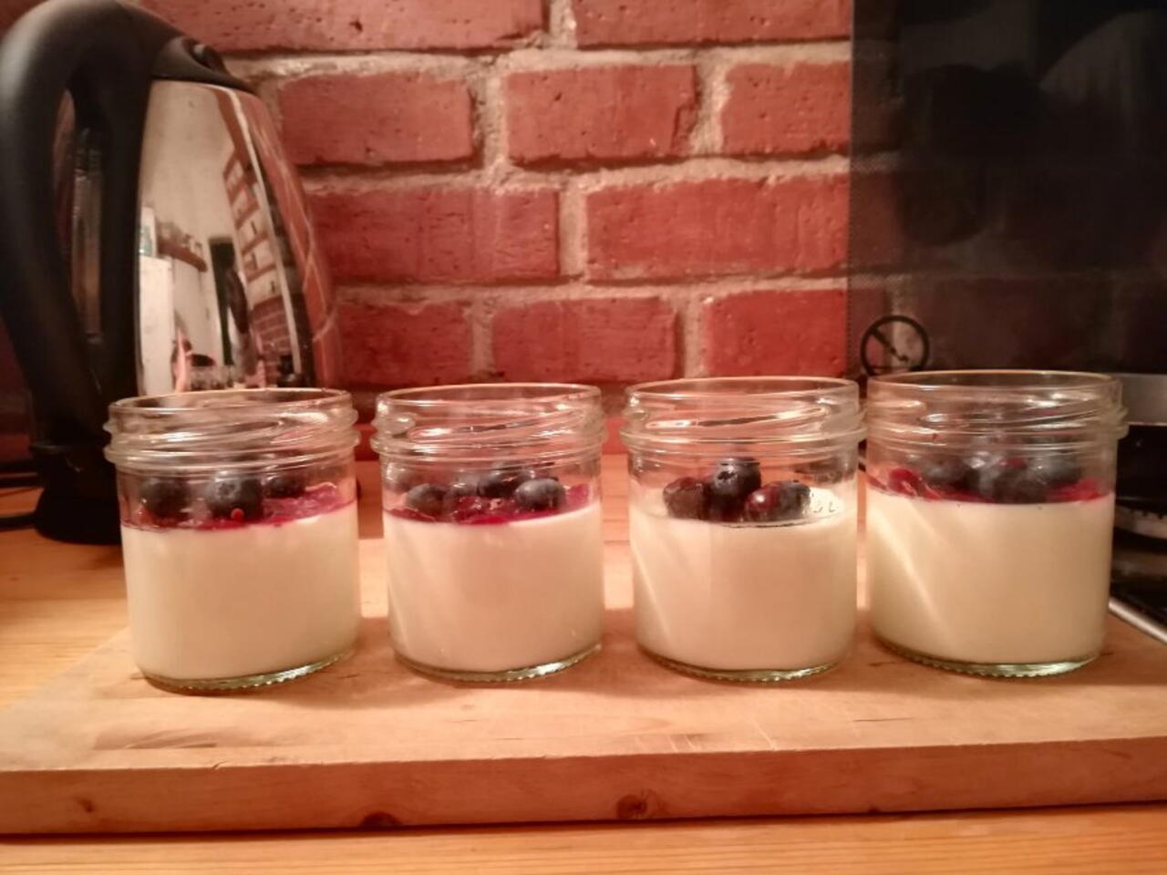 Necháme vychladnout asi 3 hodiny v lednici, ať směs ztuhne. Poté navrch natřeme tenkou vrstvu marmelády a zasypeme borůvkami (nebo jiným ovocem). Kdo má rád čokoládu, tak si rozpustí pár kousků s máslem a zalije panna cottu čokoládou.
