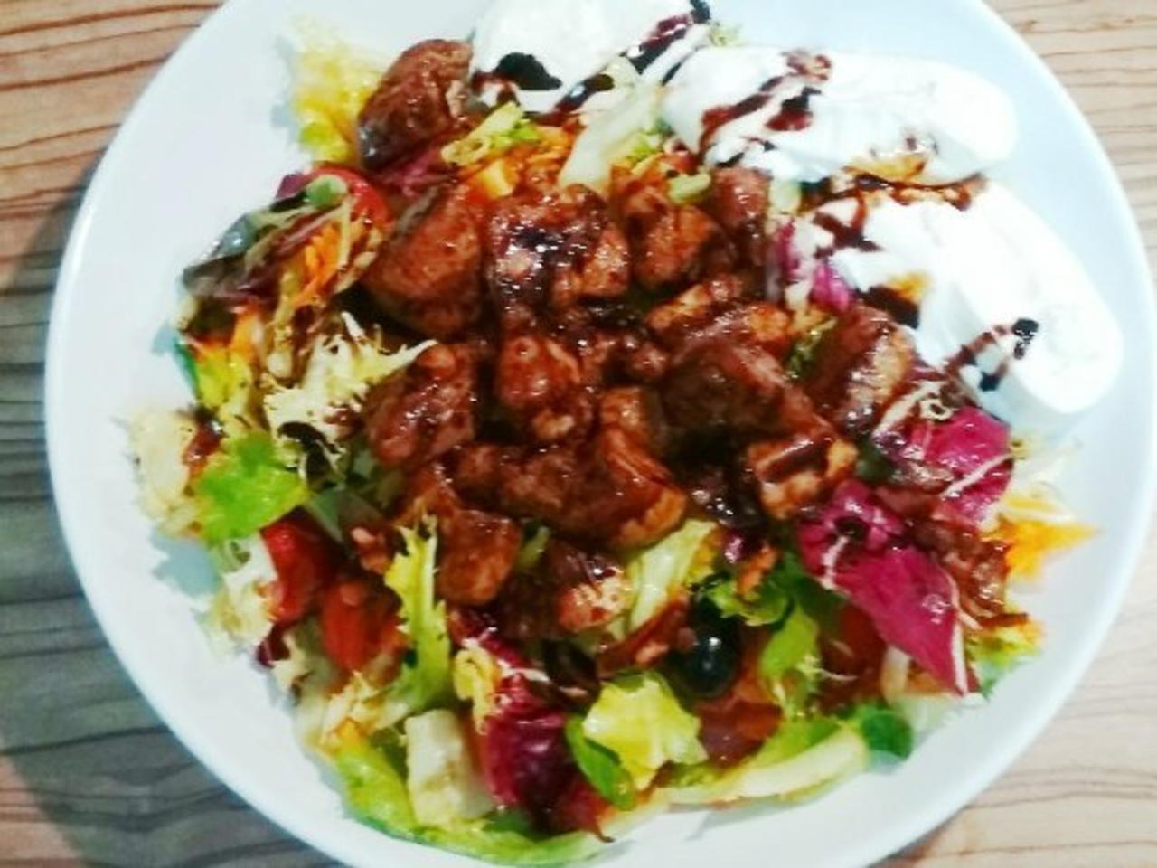 Na salát dáme maso, burratu a polejeme balsamico creme.