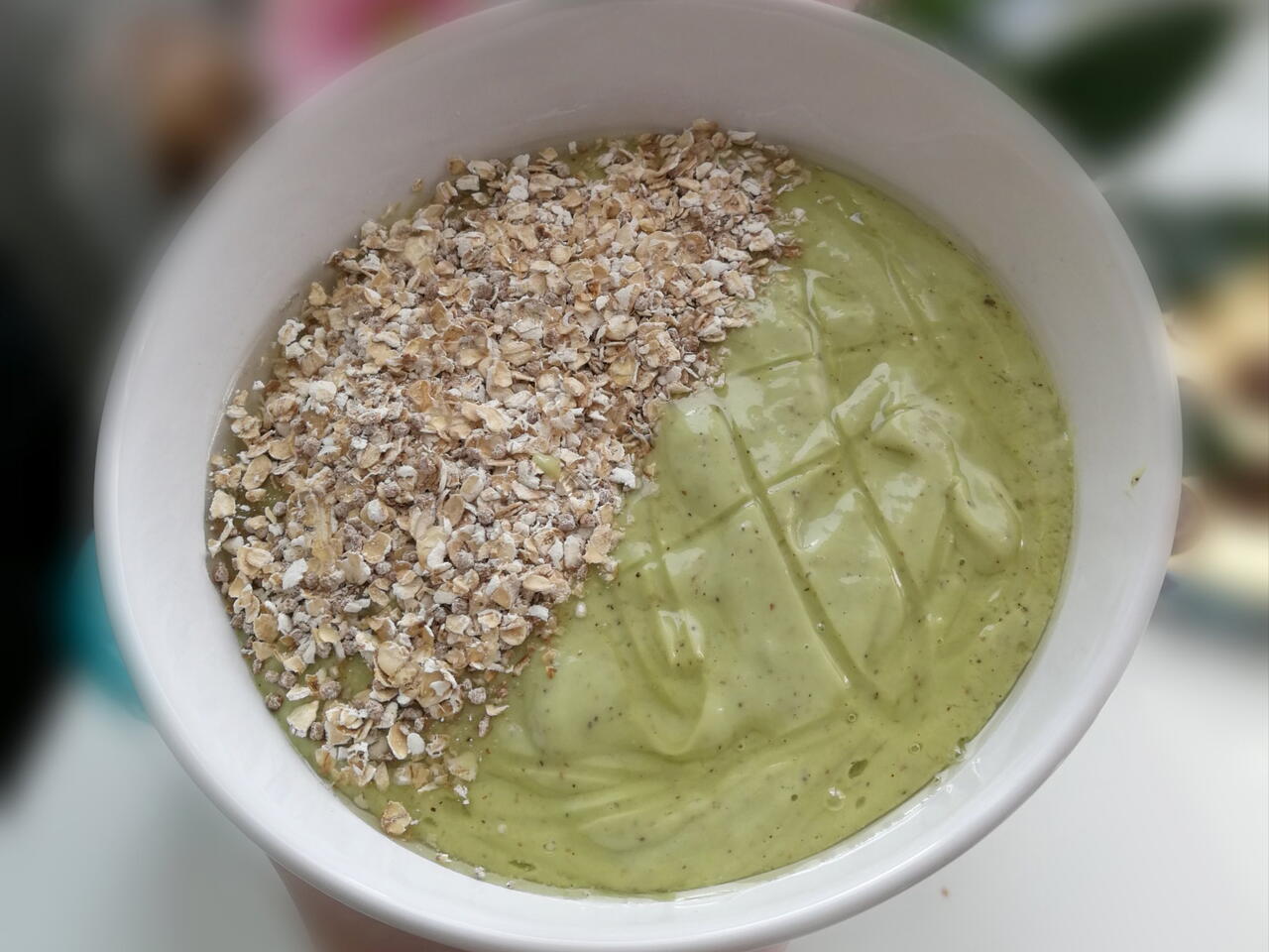 Avokádo a kiwi nakrájíme na kostičky, přidáme šťávu z pomeranče, jogurt, lněné semínka a vše rozmixujeme. Pokud je směs moc hustá přidáme vodu. Dozdobila jsem ovesnými vločkami a agáve sirupem.