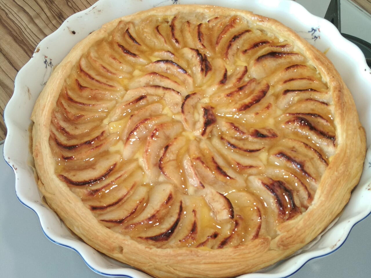 Na krém naskládáme na plátky nakrájená jablka (použila jsem 3 středně veliká jablka), poprášíme moučkovým cukrem a dáme péct do trouby bez horkého vzduchu na 200°C asi 35 minut do mírného opečení jablek.