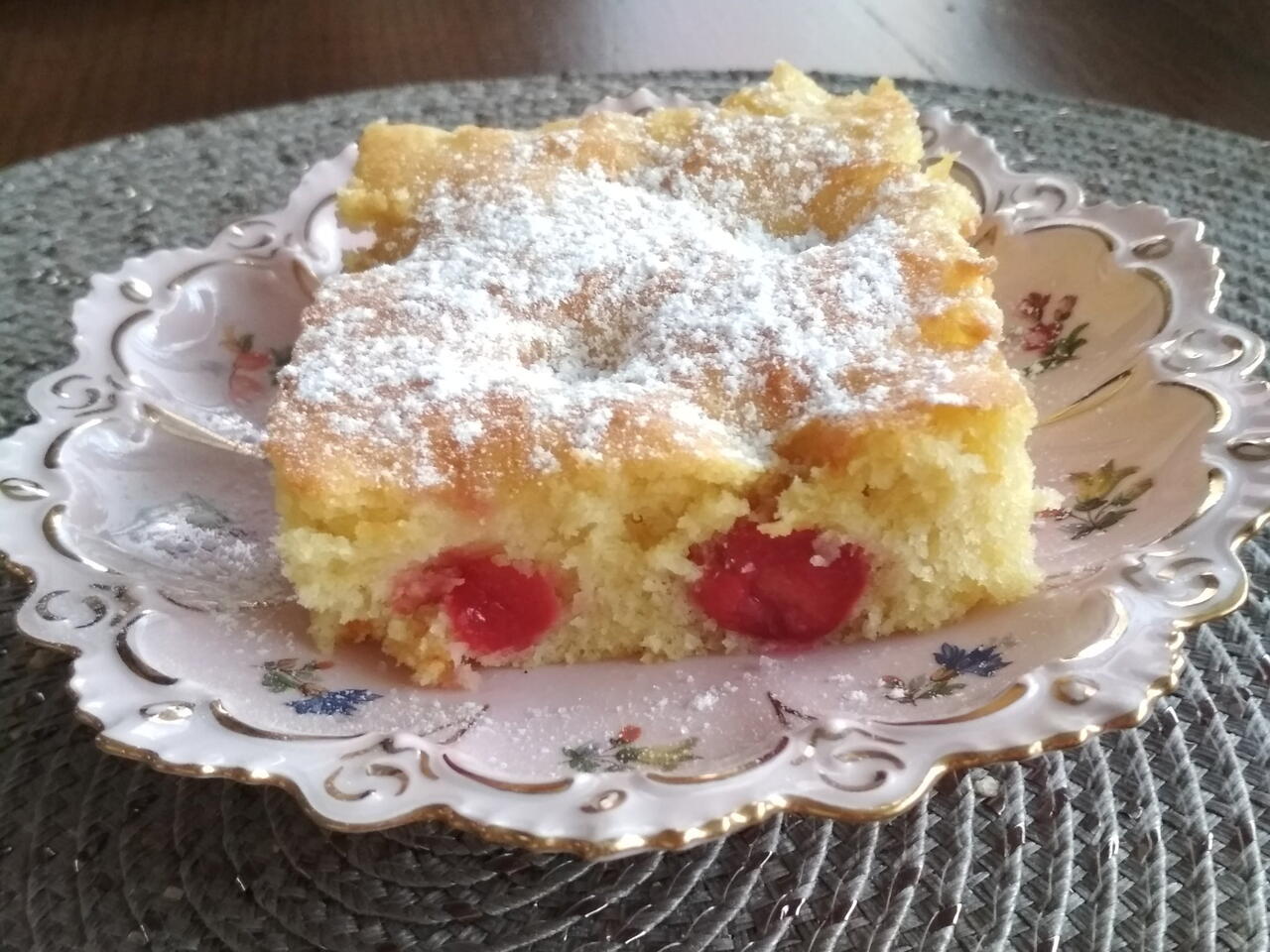 Těsto nalít do pekáče a nazdobíme třešněmi.