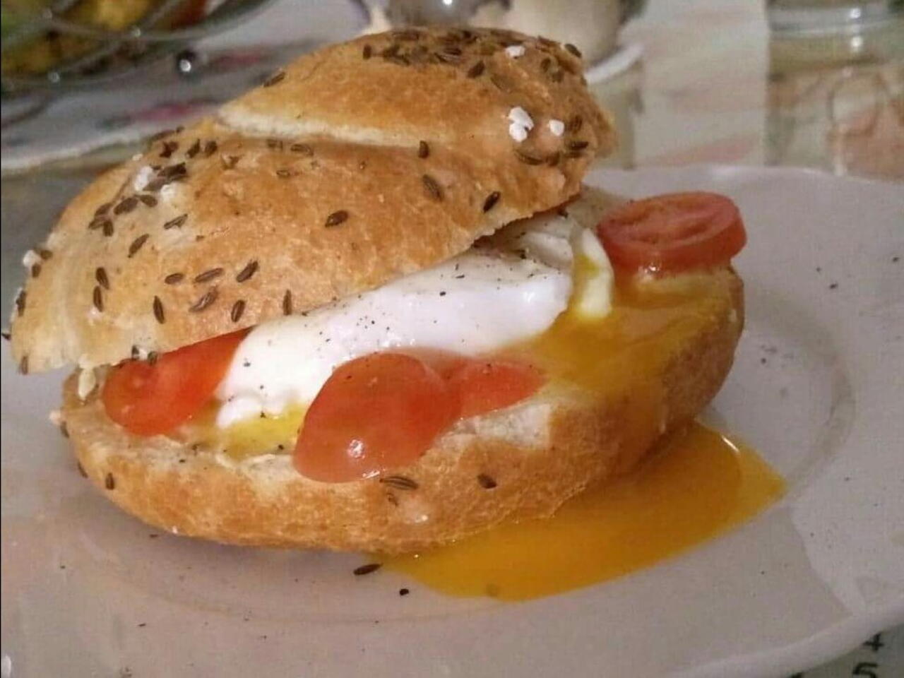 Přiklopíme druhou půlkou housky a vejce opatrně rozřízneme v místě žloutku, takhle bude krásně vytékat ven.