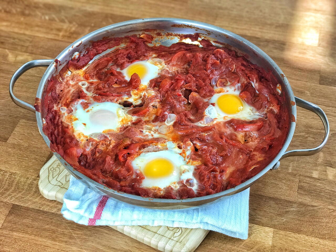 Dig some little egg-sized divots in the surface of the sauce. Crack an egg into each one. With a spatula, try your best to spread the egg whites out on the surface of the sauce without breaking the yolk so the whites will cook faster.