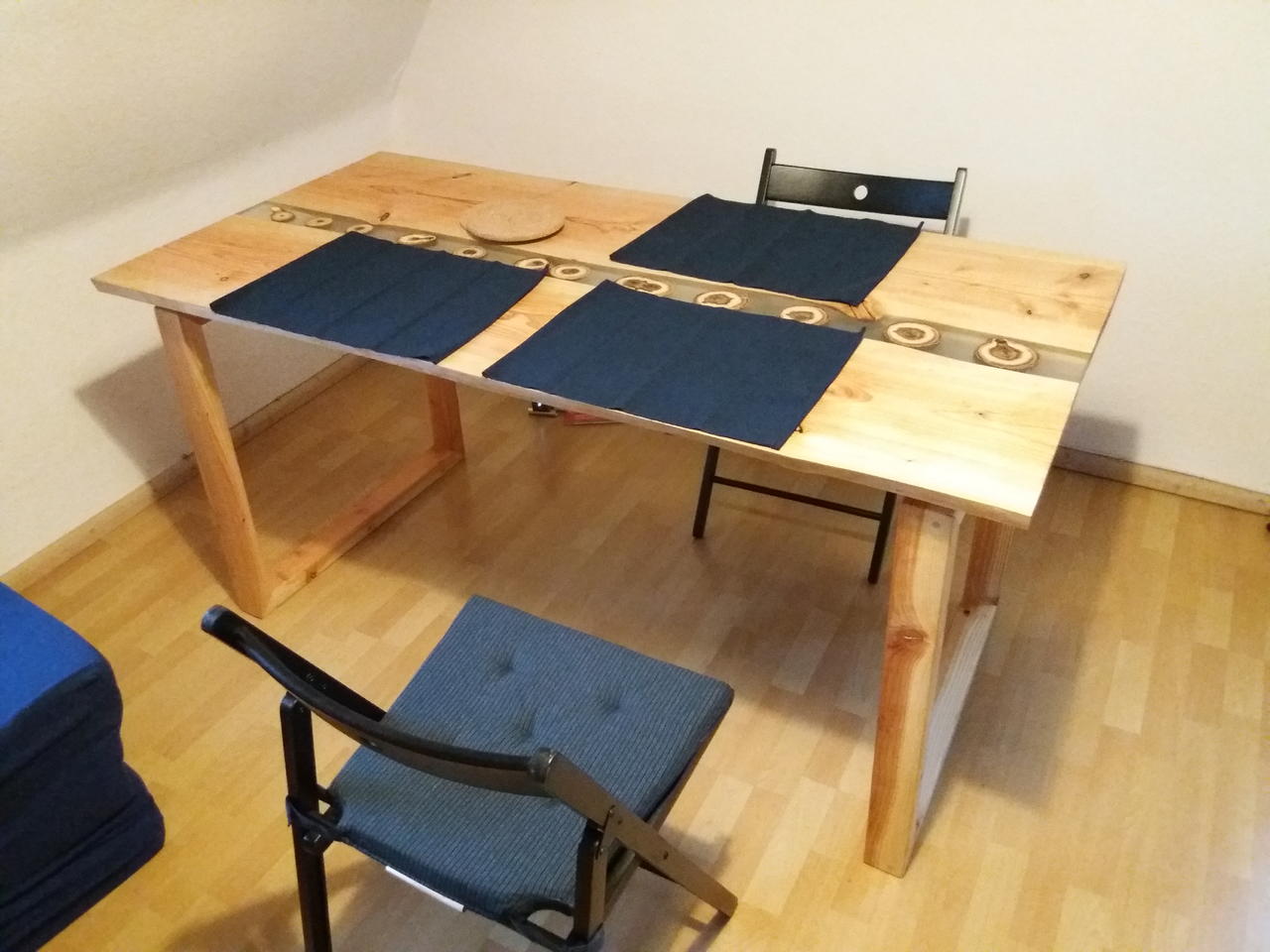 Bretter grob schleifen, Ast in Scheiben sägen, Tisch in entgültige Position bringen und fixieren, Dann die Obereite! Abkleben und alles umdrehen