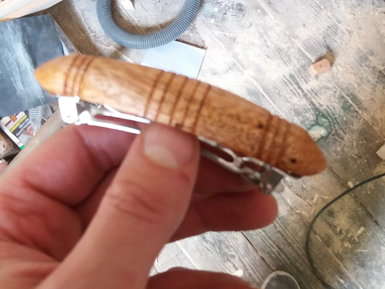 Gewünschte Außenform drechseln. An der Bandsäge zusägen und auf der Spange anscharauben. Ich habe eine alte Haarspange genommen, auf die ich den Holzschmuck gesetzt habe.