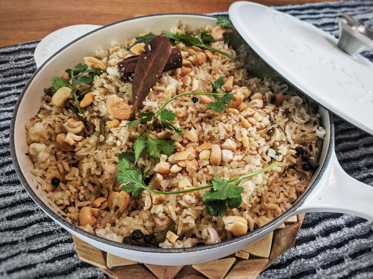 Mit Koriander und zerhackten Cashewnüssen garnieren.