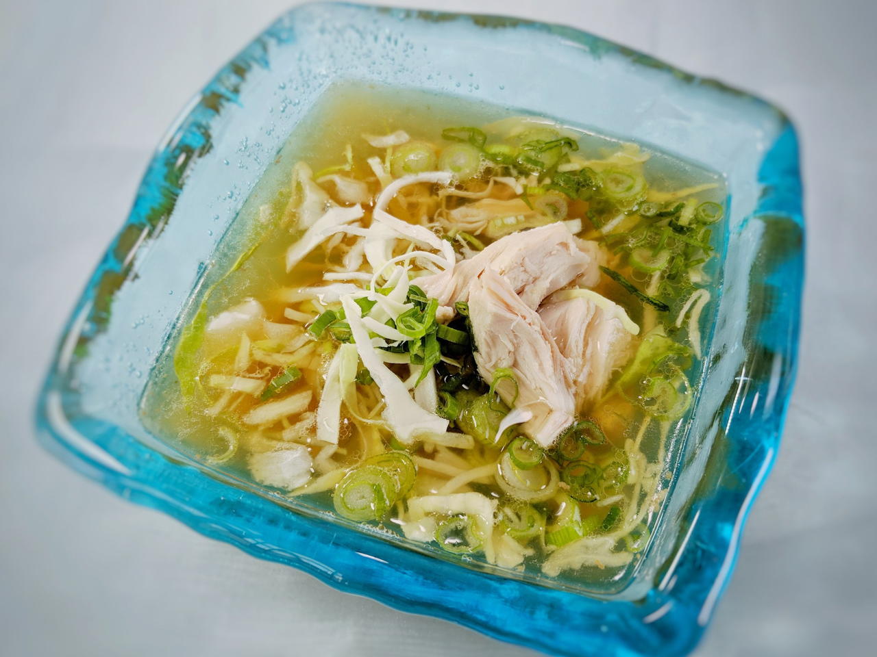 Zerteile das ganze Brathähnchen, entferne alle Knoche, gib sie mit Knoblauch, Ingwer und Frühlingszwiebeln in einen Topf und lass das Ganze mehrere Stunden köcheln. Mit einem Schnellkochtopf geht es allerdings rascher, die Garzeit beträgt 1 Stunde bei hohem Druck, anschließend abseihen.