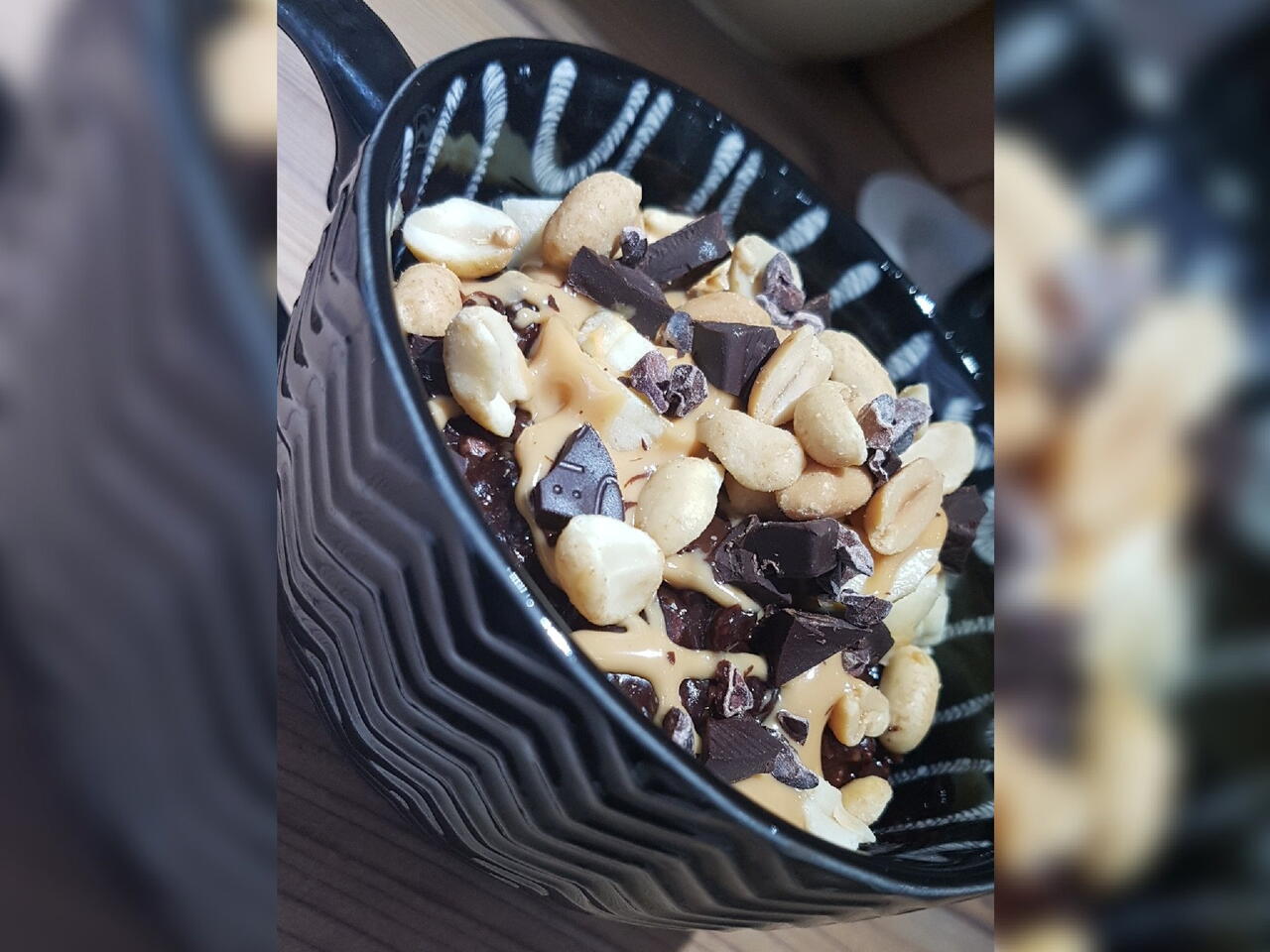 Fülle das Porridge in ein Gefäß. Als Topping kann man nun Erdnussmus, Banane, Erdnüsse und Schokolade auf der Oberfläche verteilen.