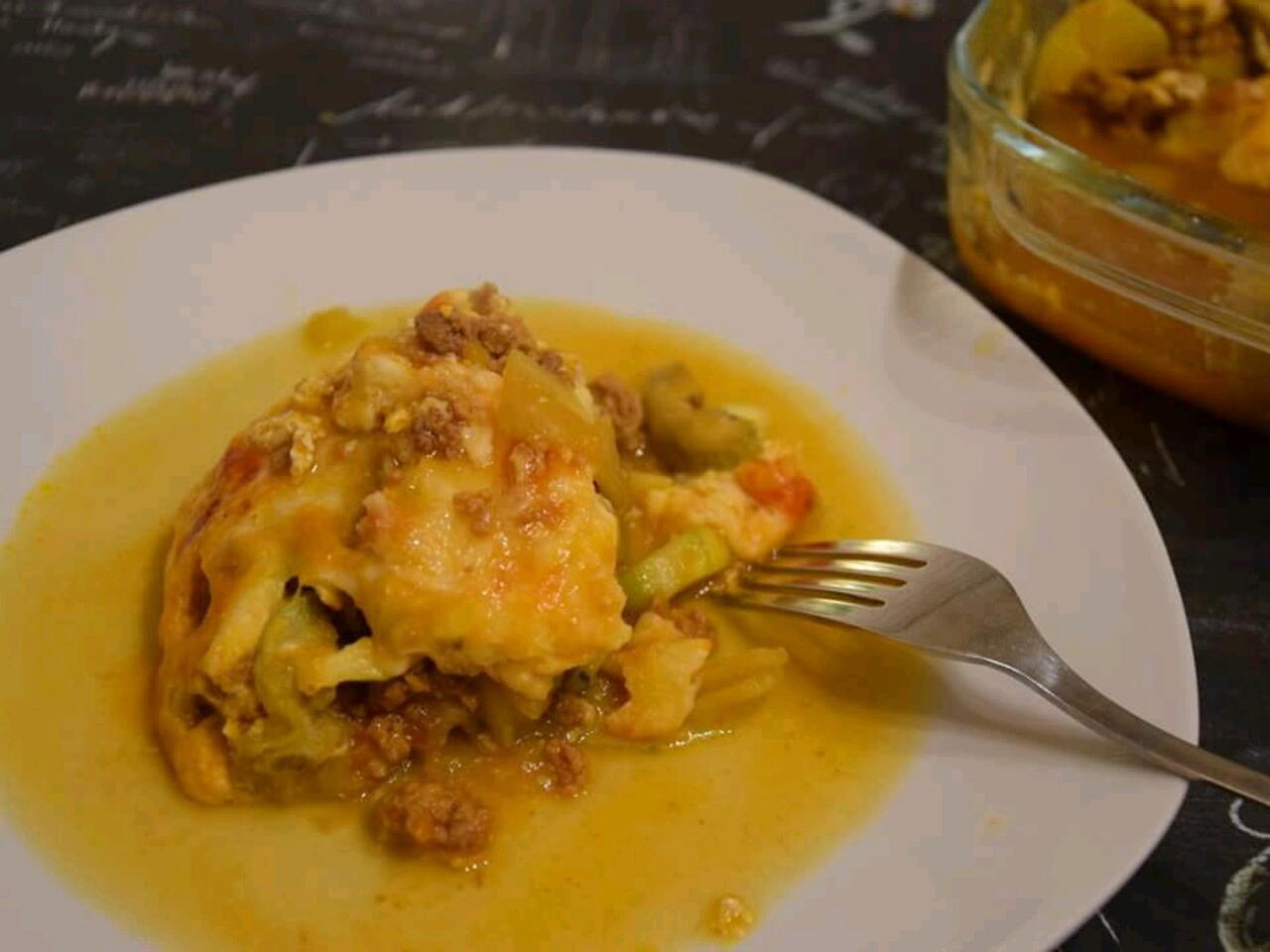 Auflaufform damit befüllen.Eier mit Sahne, Milch und Gewürzen verschlagen, Auflauf damit begießen und mit Käse bestreuen.Im vorgeheiztem Backofen bei 180 ° ca. 20 - 30 Min. backen, bis der Käse geschmolzen und goldbraun geworden ist.
