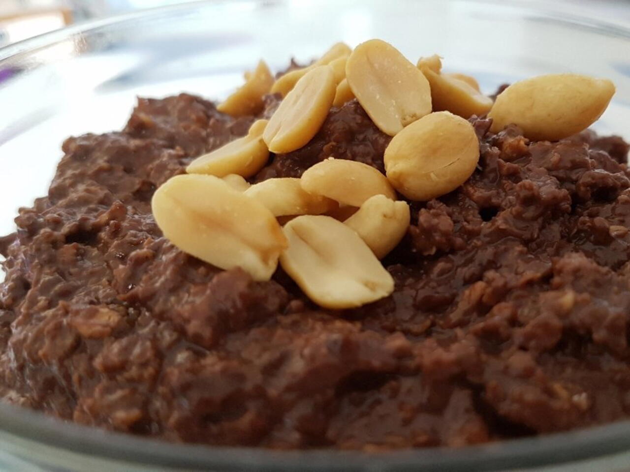 Nach Belieben Erdnussbutter unterrühren und die Haferflocken mit Erdnüssen garnieren