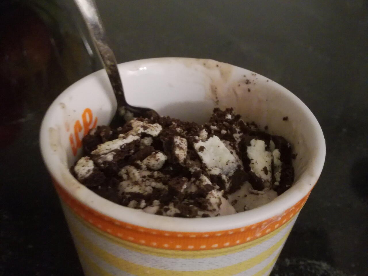 Währenddessen, Kekse zerkrümeln . Ein paar Krümelstücke beiseite legen für die Deko.