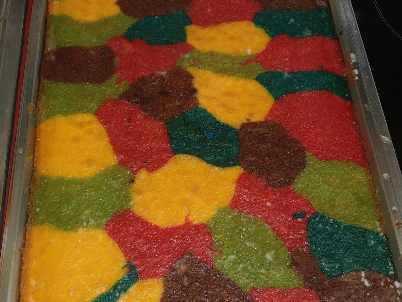 Den Backofen auf 160°C vorheizen. Den Teig in 5 Teile teilen und jeweils eine Lebensmittelfarbe, kakao und vanillepudding unterheben. In Klecksen auf ein gefettetes Backblech geben, sodass es schön bunt aussieht.