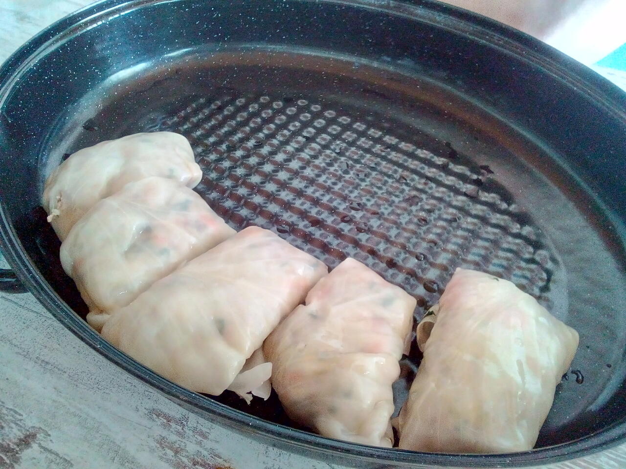 Krautkopf vorsichtig (Blatt für Blatt) Trennen. Die Blätter gut waschen und in einem Sieb abtropfen lassen. Die gebratene Füllung ca ein bis zwei Löffel auf ein Blatt geben und wie Roulladen einrollen und in einen Bräter oder eine tiefe Bachofenform geben (Am besten mit Deckel).