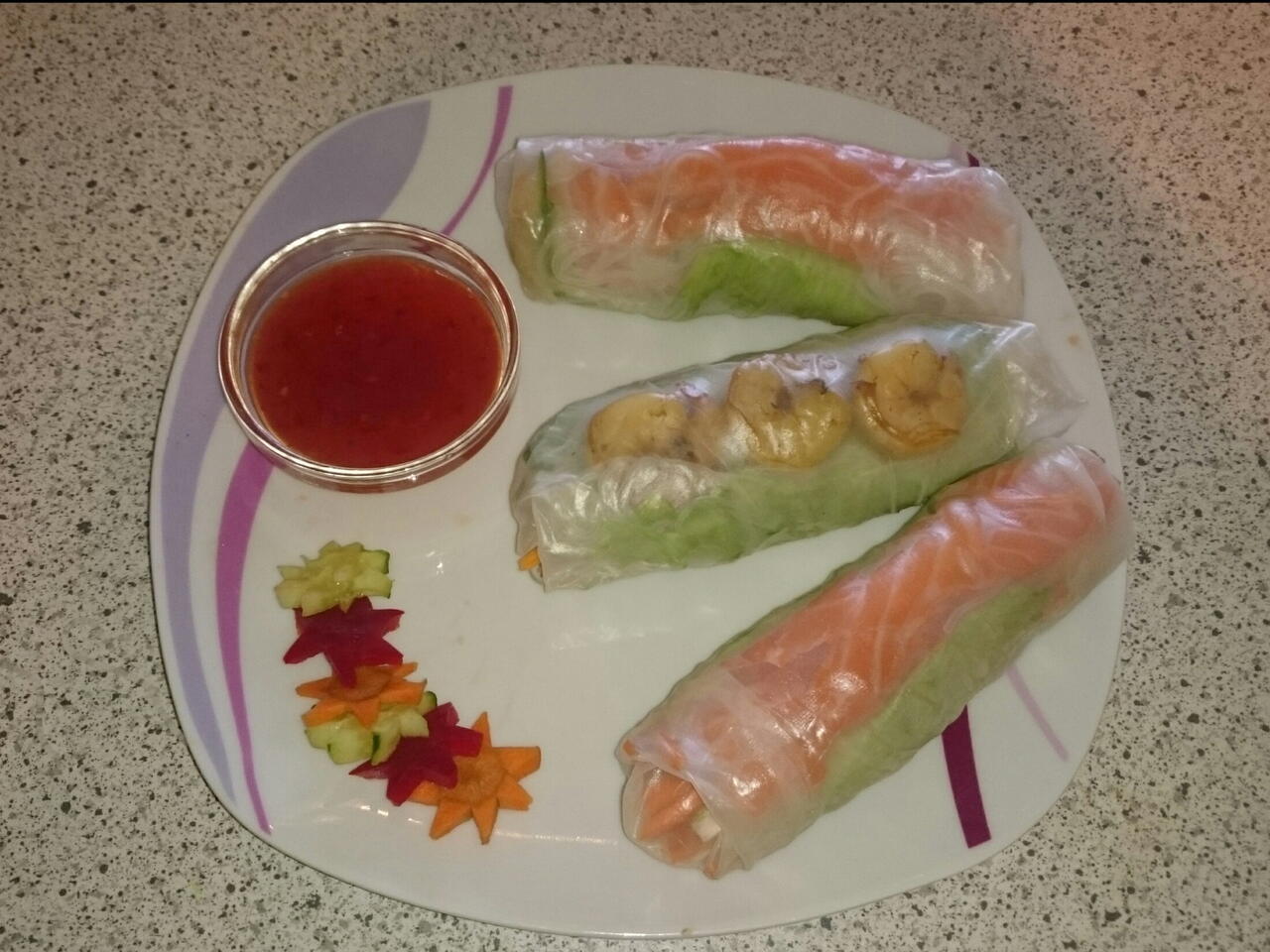 Je 1 Blatt Reispapier kurz von beiden Seiten unter kaltes Wasser halten. Das untere Ende des Reispapiers mit einem Stück Eisbergsalat, den Gemüsestreifen u ein paar Glasnudeln belegen, so dass rechts u links noch ein wenig Platz zum einklappen ist. Nun rechts und links die Seiten einklappen und zur Hälfte straff aufwickeln. Bevor man die Rolle ganz aufwickelt etwas Lachs bzw. 3 Garneln mit einwickeln.