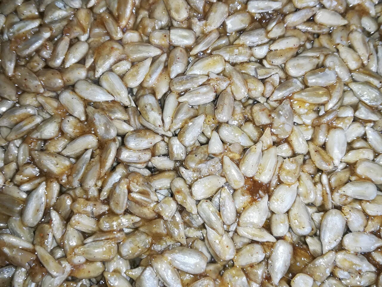 Den Zucker in einer beschichten Pfanne karamellisieren lassen mit dem Rosenwasser ablöschen und mit Zimt würzen. Sonnenblumenkerne dazu geben alles vermengen. Auf einem Blatt Backpapier glatt streichen. Auskühlen lassen.