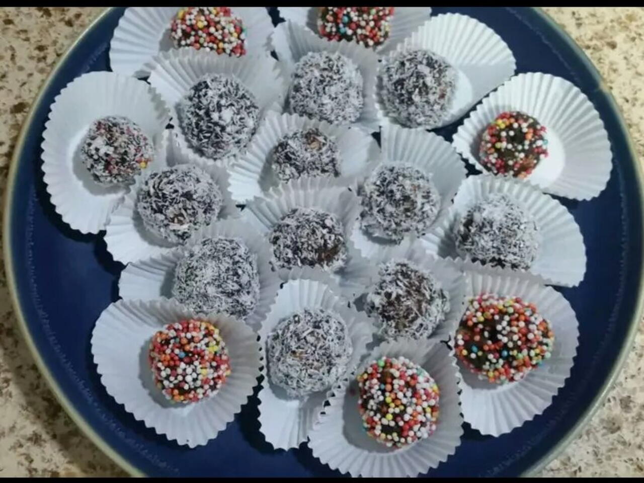 ومن ثم نخلطه ونشكله لدوائر ووضع فوقه جوز هند ووضعه في الثلاجه