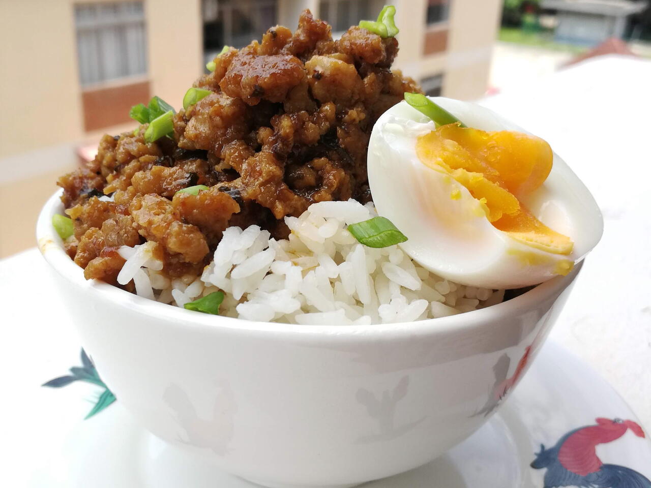 Heat up the sauce mixture then add in some sesame oil till itβs almost thicken then add in the cooked ground pork and mix well and break it all up into small bits , off heat and serve with plain white rice and soft boiled eggs