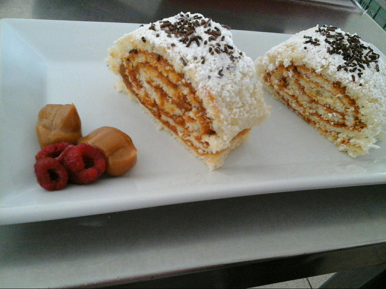 Una vez que sale del horno enrollar y rellenar con manjar. Luego decorar a gusto.