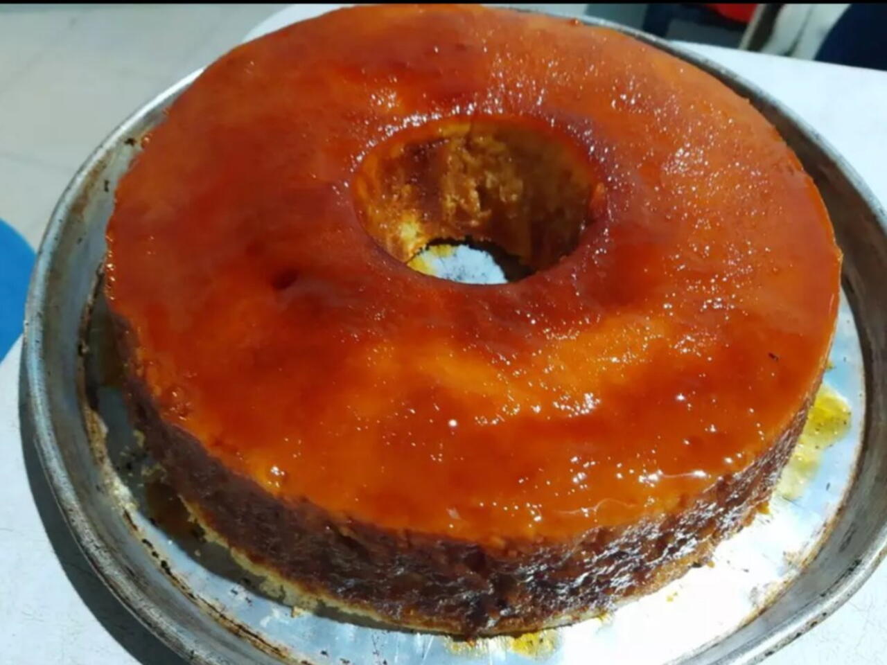Distribuye el caramelo de forma pareja por todo el molde, base y paredes y deja que se enfríe. La idea es que quede como en la foto, que cubra toda la superficie del molde para que el budín de pan casero quede perfecto.