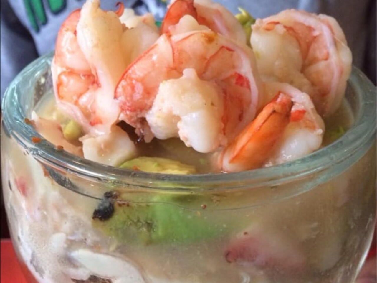 Añadir a la copa el pulpo cocido, camarón cocido, camarón crudo y ostiones.