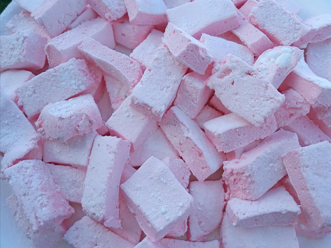 Mezclar la gelatina sin sabor con la agua y el azúcar. Poner a hervir por 3 minutos.Disolver la gelatina, yo elegir frutilla por eso me quedaron rosa, y agregar a la preparación anterior. Hervir por otros 4 minutos revolviendo para que no se queme.Inmediatamente retirar del fuego y volcar en un bol. Batir hasta que tome consistencia de merengue. Puede tardar así que paciencia en este paso.Preparar una fuente con azúcar glas para que no se pegue y volcar el batido. Llevar al freezer por una hora