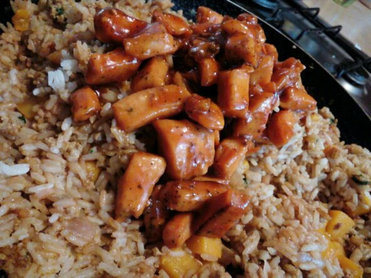 Mientras se va dotando le echas el vinagre blanco, el jugo de naranja, la miel, el Tamarindo y el dulce de durazno, revolvemos y esperamos a que se evapore el líquido a fuego bajo.