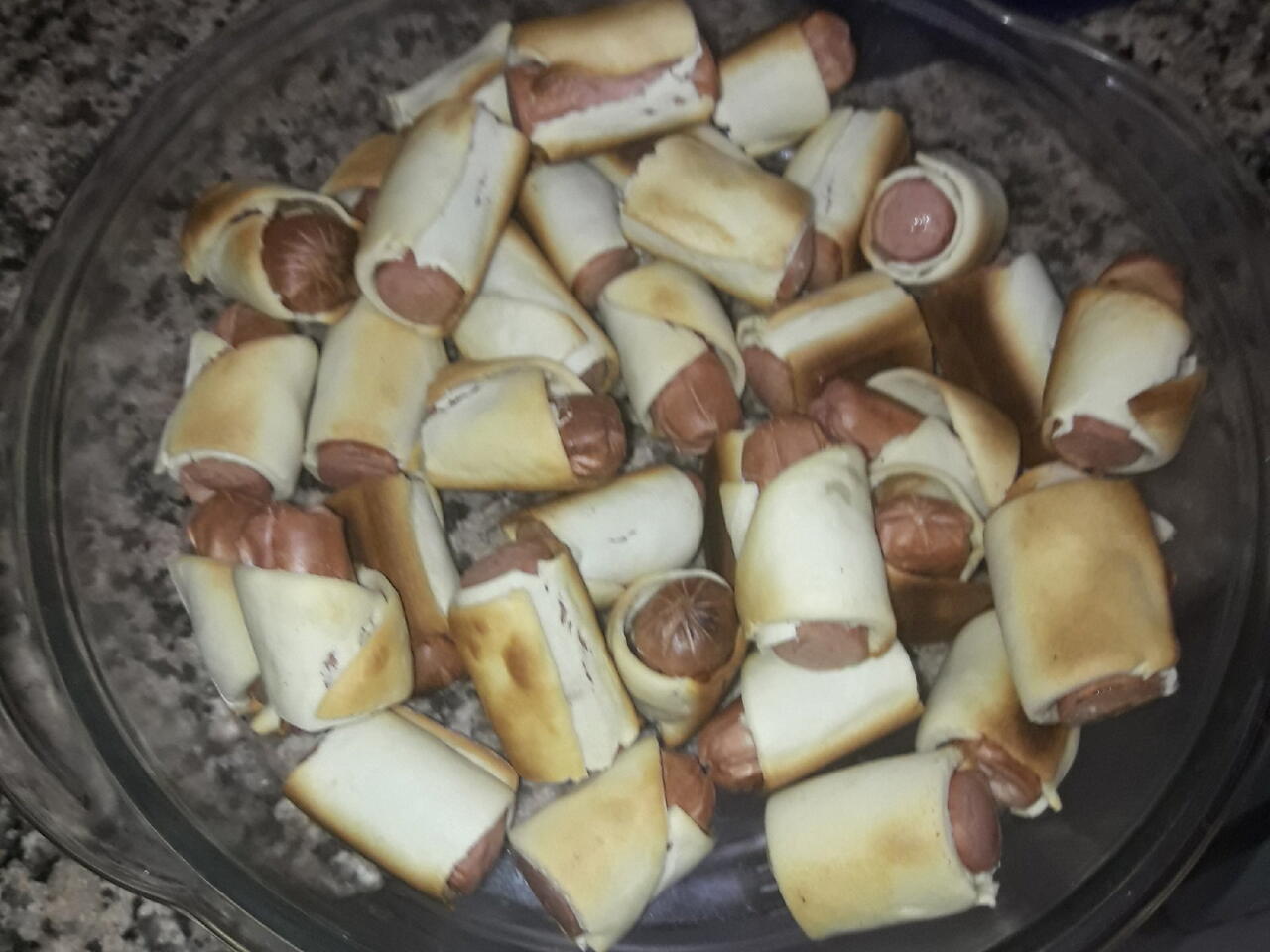En el centro de la masa colocar una salchicha y enrollar. Con un cuchillo, cortar en tres y colocar en una bandeja aceitada. En total quedan 36 unidades.