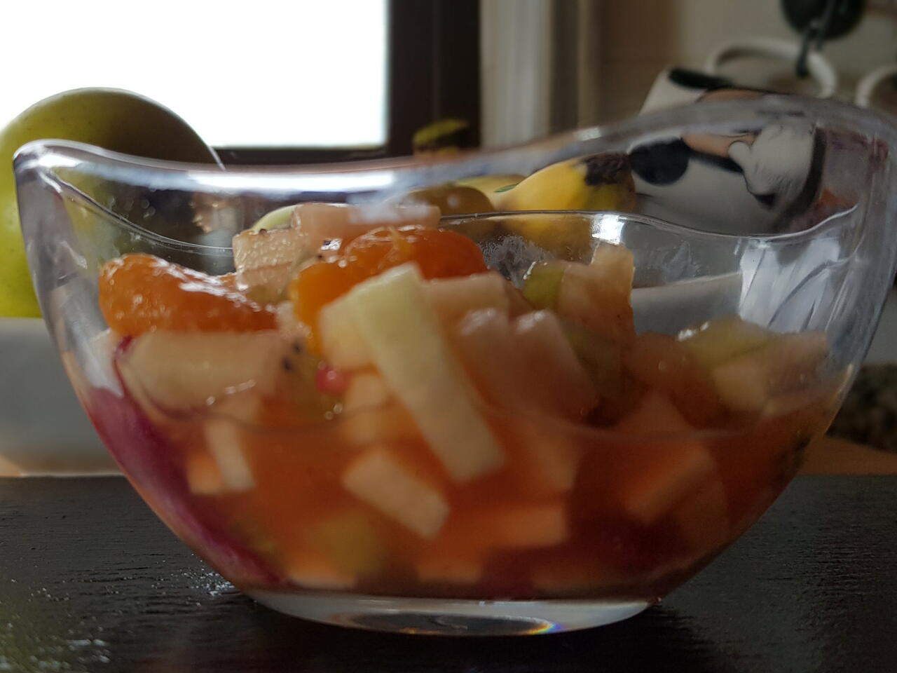 Esta es una receta muy facil, cortamos todas las frutas en trozos pequeños acompañado de un buen zumo de naranja y listo dejamos a enfriar. asi tenemos un rico coctel de frutas.