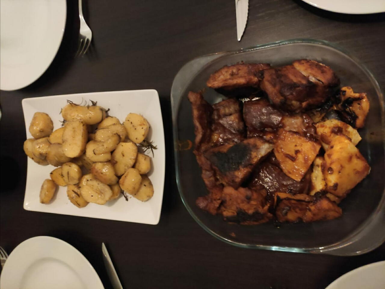 Pincelamos la carne con la mitad de la salsa y dejamos macerar unas 4 h. Precalentamos el horno a 200°, metemos las costillas 15 min. Sacamos la carne y volvemos a pincelar la carne con el resto de la salsa y volteamos las costillas, volvemos a meter las costillas otros 20min. Probamos que estén hechas y servimos. Yo las acompañe con Piña y unas patatas al horno.