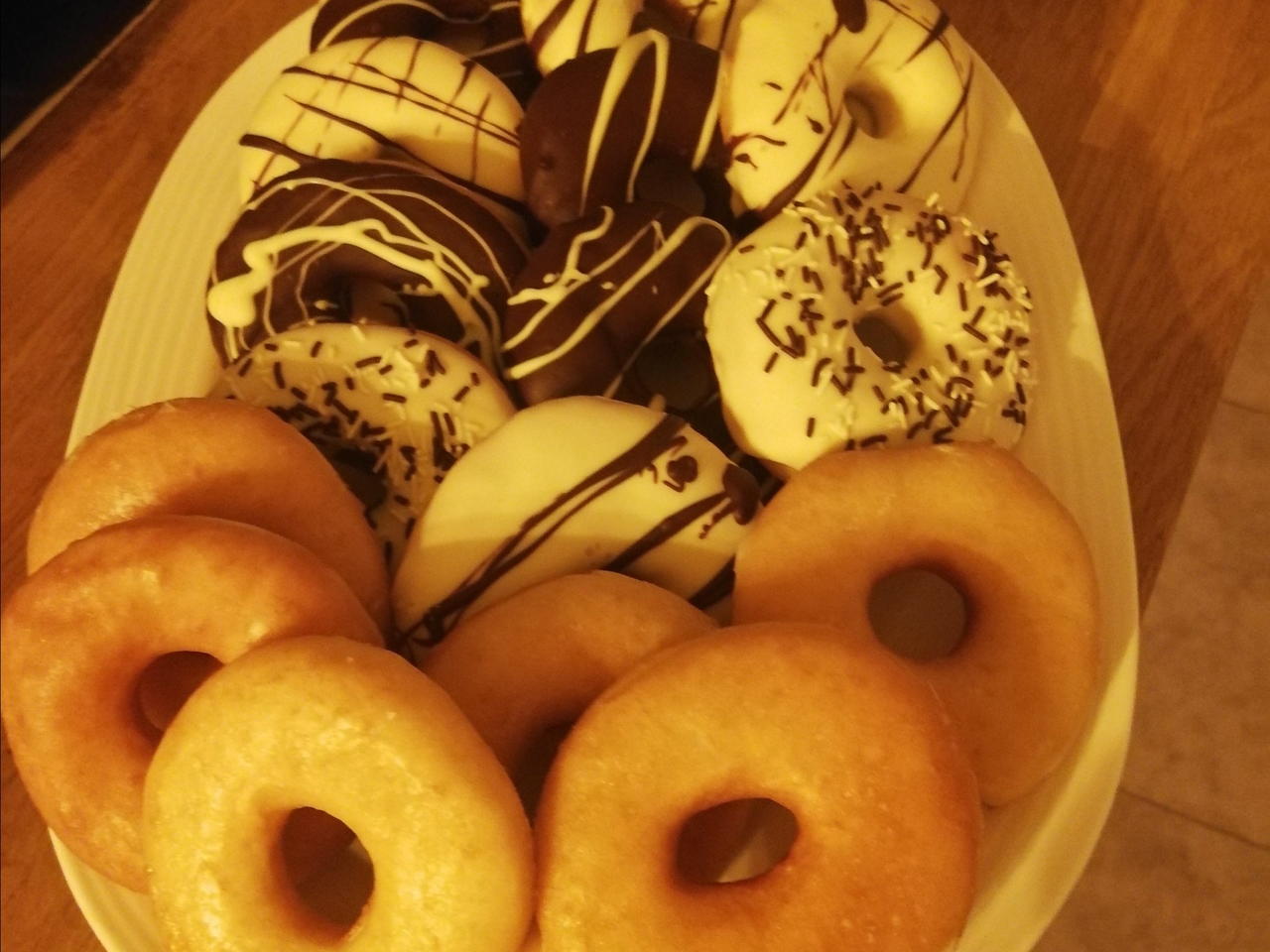 Vamos mojando los donuts uno a uno y los dejamos secar en una bandeja por separado.