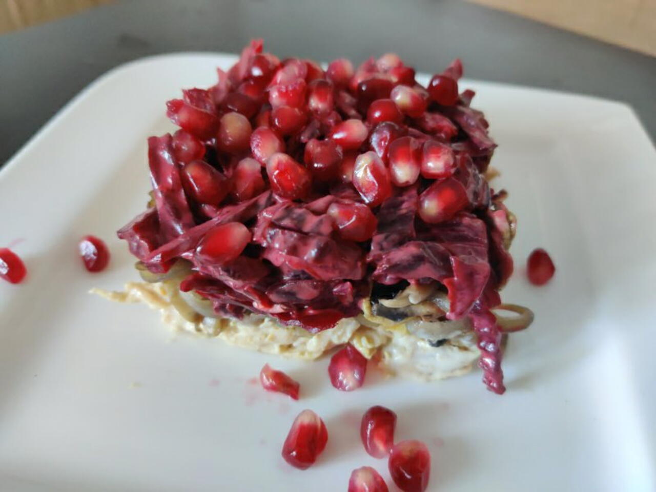 Se pone la primera capa de pollo bien extendida en una bandeja, se le añaden unas nueces peladas y sobre esta la capa de champiñones y luego la de remolacha. Como toque final para decorarlo los granos de granada sobre la capa de remolacha y ciruelas.